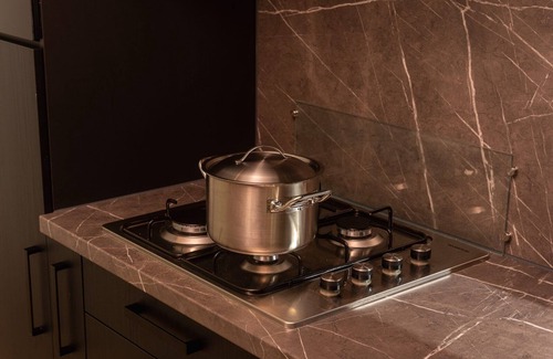 Prepara una comida casera en la cocina, equipada con placa de cocina, frigorífico y lavavajillas, además de cafetera y tetera y microondas.