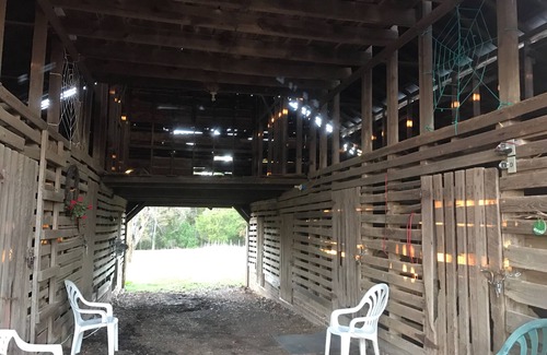 ANTIGUO, rústico, auténtico, granero del país. Seco cubierto y espacioso. 4 puestos con 2 salas de tachuelas y un gran pasillo. Cobertizos adicionales adjuntos: granero de ahumadero y corncrib! Campo de hierba de 8 acres y un pasto de 4 acres también. Mucha sombra. 2 baños, 2 cocinas completas y múltiples salas de estar / guaridas. Ofrecemos mesas y sillas para hasta 14 personas.