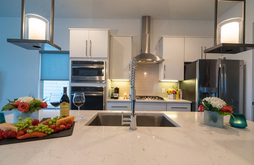 La cocina está justo detrás del comedor, con una gran isla con fregadero y lavavajillas incorporados, forrada con taburetes para 4 personas. Las encimeras de cuarzo están ubicadas entre electrodomésticos de acero inoxidable, rematadas con una estufa de gas y cafetera y cafetera Starbucks Verismo.