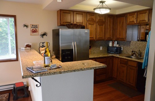 La casa está configurado con una cocina abierta que incluye electrodomésticos de acero inoxidable. Hay dos chimeneas y una gran terraza para ver los barcos locales y el de Alaska Ferry mientras disfruta de una taza caliente de café o una copa de vino. Hay 2 dormitorios con camas tamaño queen. Además, tenemos un amplio sótano a la luz del día que incluye una barra húmeda y permite acomodar hasta cuatro personas más con una litera y un sofá.