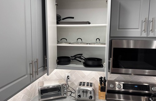 The kitchen is fully stocked with cookware, utensils, and essentials, making it easy to prepare meals or enjoy takeout from nearby restaurants.