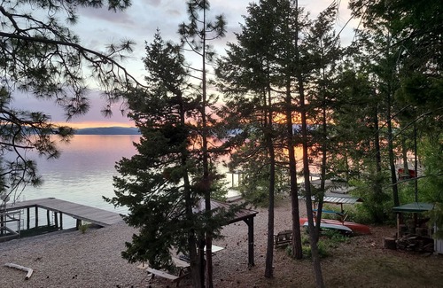 Situado en el hermoso lago Flathead entre Yellow Bay y Blue Bay en Sunset Bay (East Shore). A solo 15 millas de Big Fork y Polson, donde podrá disfrutar de cenas, compras, teatro y todo tipo de actividades divertidas. Propiedad de 1 acre con huerto de cerezos y hermosas vistas al lago con más de 109 pies de frente de lago / playa de guijarros de nivel para jugar o disfrutar de una fogata. 2 dormitorios, 2 baños y altillo para dormir. Cocina completa y dos salas de estar. Gran cubierta cubierta para ver las increíbles puestas de sol de verano mientras disfruta de una agradable barbacoa. Muelle privado con estación costera para estacionar su bote, pescar o simplemente sentarse y disfrutar el día. NO mascotas / instalaciones para no fumadores.