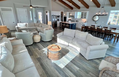 La gran sala es solo eso: ¡un espectáculo espectacular! ¡Todo el piso superior es un espacio abierto de cocina, sala y comedor con techos abovedados y una increíble vista al mar desde las innumerables ventanas y la enorme plataforma de 12'x35 'pies! Desde la terraza, puede disfrutar viendo el amanecer cada mañana con una taza de café, y luego ver el glorioso atardecer cada noche. La sala de estar tiene espacio de sobra y está lista para que todo su grupo vea una película o un gran juego en un televisor de pantalla gigante, juegue o disfrute de un tiempo de conversación muy atrasado. ¡La cocina totalmente equipada es perfecta tanto si busca comidas fáciles como cocina gourmet completa! ¡Y la gran mesa de granja permite que todos disfruten de una comida juntos! Un paseo por la despensa ofrece mucho espacio para guardar todas sus provisiones justo donde las necesita, pero fuera de la vista. Para completar este piso, hay un baño y medio y un porche cubierto con vistas a su piscina privada.