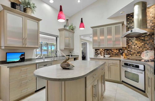 Tiene excelentes vistas de la piscina y el agua desde cualquier lugar de la cocina, y la claraboya en el techo de la catedral que se mantenga todo lo brillante, pero fresco. Los electrodomésticos son de perfil GE de acero inoxidable, perfectos para el chef gourmet o la preparación diaria de alimentos.
