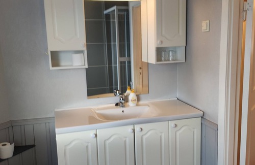 There is one bathroom, which has a toilet and sink and a walk-in shower.