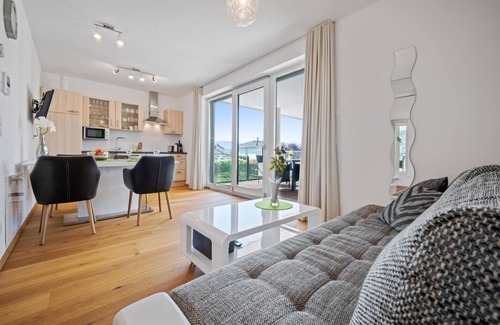 Este luminoso y moderno apartamento de vacaciones le da la bienvenida con un ambiente agradable, en el que el mobiliario de buen gusto y mucha luz natural crean un verdadero ambiente de bienestar. Las ventanas del suelo al techo abren una encantadora vista del lago Wörthersee. Disfrute de armoniosas comidas en la acogedora mesa de comedor y póngase cómodo en el sofá para disfrutar de una tarde de cine después de un activo día al aire libre.