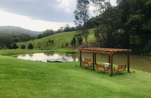 Una verdaderamente magnífica granja de 50 acres establecida en Byron Bay Hinterland (Byron Shire). Un lugar especial para que su familia esté junta sin todas las distracciones de la ciudad; un lugar para compartir tiempo con otras familias; o un momento para que los amigos disfruten juntos de la compañía en los hermosos Northern Rivers. No hay razón para irse si no quiere. Relájese en el pontón de la presa durante el día, o en el lujoso spa para 6 personas situado debajo del pabellón de las glicinas, y siéntese alrededor de la fogata de arenisca por la noche.