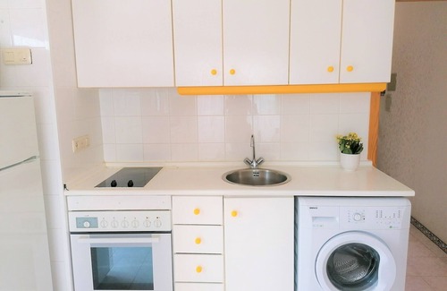 La cocina americana, de vitrocerámica, está equipada con nevera, microondas, horno, congelador, lavadora, vajilla, cubertería, utensilios de cocina y cafetera.