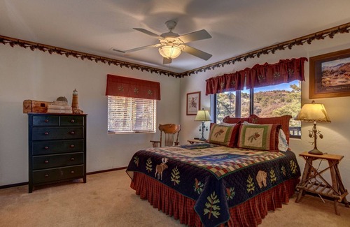 El Forest Glen Lodge es una cabaña bellamente decorada con 5 habitaciones en 3 niveles. Esta casa duerme 16 con 5 reinas, 4 gemelas y un colchón inflable. Esta propiedad de lujo está ubicada en los pinos altos a solo 9 millas o 20 minutos al norte / oeste del centro de Prescott. Un gran jacuzzi al aire libre se encuentra en un patio con vistas a los pinos y las estrellas. Una bonita sala de juegos en el nivel inferior tiene una mesa de futbolín y una mesa combinada de billar / air hockey con una mesa de ping-pong extraíble. Esta área se abre a una terraza con un conjunto de patio. A un lado de la sala de juegos hay dos dormitorios, con 2 camas queen size y un baño. En el otro lado de la sala de juegos hay un kids & amp; rsquo; zona con 4 camas individuales y TV. El nivel principal tiene una gran chimenea de roca, televisión vía satélite y estéreo. La sala de estar, el comedor y el dormitorio principal con cama de matrimonio se abren a una gran terraza con juegos de patio, salones, parrilla de gas y maravillosas vistas. Hay un baño principal y tocador. Una gran cocina personalizada se encuentra junto al comedor y al lavadero. El nivel superior tiene dos habitaciones queen y un baño completo. Las paredes y los estantes de la casa están adornados con artículos interesantes y únicos que los propietarios de Forest Glen Lodge han recogido de todo el mundo. Todo el lodge cuenta con WiFi DSL. Hay un garaje para 2 autos que pueden ser utilizados por los huéspedes. El aire acondicionado central hace que esta encantadora cabaña del bosque sea fresca incluso durante los cálidos días de verano. Una lavadora / secadora y una cocina completamente equipada hacen que la estadía sea más cómoda. Forest Glen Lodge es una casa personalizada con maravillosas vistas y muchas características mejoradas. Solo necesita traer comida y ropa, ya que todo lo demás se proporciona para su estadía tranquila. ¡Reserve esto ahora para una de las mejores vacaciones en Prescott! Esta propiedad permite perros. Los perros cuestan $ 15 por perro por noche más impuestos. También hay una tarifa plana de $ 10 que se le da al ama de llaves.