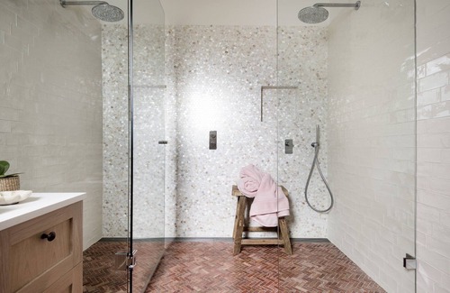 Baño nuevo, ducha doble (sin bañera) con suelo radiante.