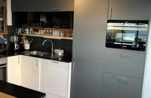 Con hermosos volúmenes, decoración encantadora, el apartamento tiene una gran sala de estar (40 m²) en el paseo marítimo que se extiende hacia la terraza redondeada (40 m²) con vistas panorámicas de la bahía de Quiberon. El salón se comunica con la cocina americana abierta. La moderna cocina está totalmente equipada. Los aparatos son de la marca Siemens ° o equivalente (Bosch °, AEG °). La cocina también tiene un pequeño balcón con vista al mar.