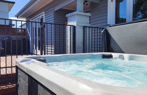 The home has undergone a full refurbishment and features high stud ceilings, an open-plan living and kitchen space, and a butler’s pantry, ensuring a modern and functional environment. The design emphasizes a seamless indoor-outdoor flow, which is particularly evident in the master bedroom, where bifolding doors provide direct access to the large deck, hot tub, and front yard.