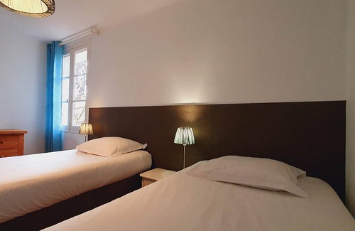 Una habitación equipada con una cama de 160x200 y una habitación con dos camas de 90x190 combinables. Un baño con bañera y WC separado.