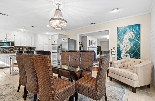 Inmediatamente después de ingresar a esta casa, lo reciben con una decoración costera relajante pero elegante. Justo al lado del vestíbulo se encuentra la sala de estar principal, el área de la cocina y el pasillo a los 3 dormitorios. Esta casa cuenta con una combinación de hermosos pisos de madera y baldosas en toda la casa. La sala de estar, que tiene vistas a la piscina y al patio trasero, ofrece amplios y cómodos asientos para mirar televisión o leer. El área para comer, que está abierta a la sala de estar y la cocina, cuenta con una mesa de madera estilo picnic, así como un fácil acceso al patio trasero para asar a la parrilla o en la piscina. Si te gusta cocinar mientras estás de vacaciones, esta cocina no te decepcionará. Algunos de los aspectos más destacados de esta cocina renovada incluyen un amplio espacio de encimera, hornos dobles y una despensa.