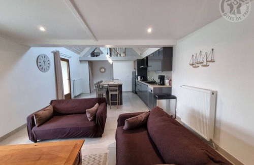 On the ground floor: living room with equipped kitchen (microwave, dishwasher, fan oven, ceramic hob, freezer, washing machine). Living room with sofas and 70cm flat screen TV.