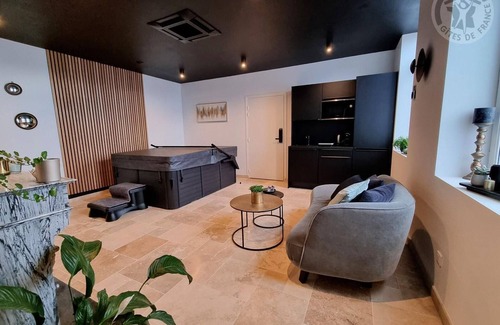 Living room with sofa, high table with 2 high stools and private spa. WIFI (fiber).