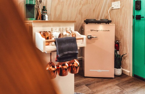 Relájate en el porche o patio o tómate algo en el brasero de jardín de esta casa móvil de 14 m². Para cambiar un poco, entra y disfruta del wifi gratis.