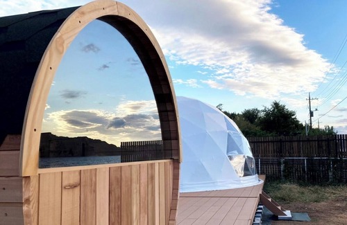 Glamping dome tent bathed in the setting sun in Se / Onomichi Hiroshima | Casa en Onomichi