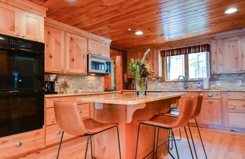 Paredes y techos de pino nudoso se jactan en toda la gran sala. Una chimenea de piedra bellamente diseñada se destaca como el punto focal. Levanta un lugar en el sofá y mira cómo brilla el fuego en una noche fría. En el otro extremo de la habitación, un banco en la esquina es el lugar perfecto para acurrucarse con un buen libro.
