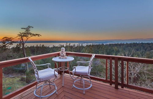 Samadhi House está ubicado en la cima del Mt. Dallas, el punto más alto en la isla de San Juan en el estado de Washington. Cuenta con unas vistas espectaculares del estrecho de Haro (separa los los EE.UU. desde Canadá), las Islas del Golfo de Canadá, Isla de Vancouver, y montañas boscosas. Rodeado por las glorias del NW naturaleza, no se puede ver una sola casa. Pero va a ver como los buques de crucero en silencio la cabeza hacia Alaska y águilas y halcones se disparan por encima. Usted también podrá ver la ruptura ocasionalmente ballenas en el Estrecho. Por la noche, podrás ver las luces lejanas de Victoria y Sydney BC El retiro privado perfecto! Además, disfrutarás del arte coleccionado de todo el mundo.