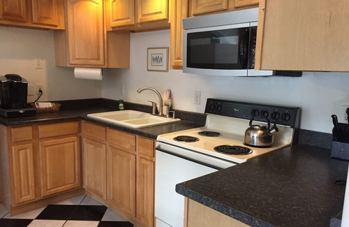La cocina está totalmente equipada con un refrigerador de tamaño completo, cuatro hornallas / horno, microondas, cafetera Keurig, cafetera, tostadora, así como cubiertos, platos, ollas y sartenes para cocinar.