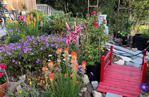 Le invitamos a visitar el patio trasero donde cultivo mis vegetales, flores y disfruto de la vista al mar.