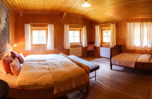 En la planta superior hay cuatro acogedoras habitaciones, todas con paneles de madera, como es habitual en las granjas. En la habitación más grande, además de la cama doble de 1,80 m de ancho, hay una cama individual de 0,90 mx 1,90 m. En las otras habitaciones hay espacio suficiente para 2 personas cada una. Estaremos encantados de preparar una cama infantil torneada a mano bajo petición.