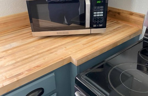 fully equipped kitchen (microwave, coffee maker, fridge, oven