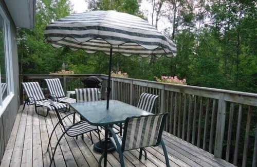 Este hermoso piso de dos habitaciones, completamente equipado y de nivel superior (para 6 personas), ubicado a medio camino entre Owen Sound y Wiarton, Ontario, cuenta con: entrada privada; chimenea de leña, sistema estéreo completo con televisión por satélite, internet inalámbrico en todo el hotel; dormitorio privado con dormitorio de matrimonio suite; dormitorio privado con cama desplegable; reina desplegable adicional en la gran sala; Sofá doble extraíble adicional en la gran sala; Baño de 3 piezas (ducha); lavandería completa; cocina con nevera / congelador, estufa / horno de convección, lavaplatos, tostadora, hervidor, cafetera, cafetera keurig, horno tostador; terraza privada con vistas al bosque mixto, barbacoa de propano, muebles de exterior; Baño adicional de 3 pzs. (ducha) en el nivel inferior en la entrada.