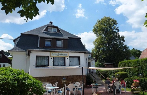 In the center of the Saxon Switzerland, surrounded by Pfaffenstein, Königstein Fortress and the Quirl-Felsen, you will find in a quiet, idyllic location in the OT Pfaffendorf of Königstein your guesthouse Lachmann. With Saxon hospitality a rich breakfast buffet awaits you in our cozy restaurant. Of course, we also offer our house guests in the evening Saxon home cooking to cool drinks. In our restaurant we serve you in the evening from 18 clock. Our lawn with a view to the Pfaffenstein invites you to relax after an exciting day in Saxon Switzerland and a cozy barbecue, you can end the day. Relax after an exhausting day of hiking exclusively in our "King's Bath" and take a glass of sparkling wine a soothing bubble bath - according to your wishes and in a completely private atmosphere. Pet fee once 10.00 €.
