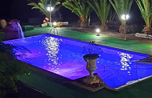 Dispone de barbacoa, piscina (climatizada opcional con coste de 28€ por día), césped de 600m2 y terraza con solarium. Todo de manera individual y privada ya que se alquila la villa de manera completa. La finca total es de 50 000m2, lo cual permite largos paseos en medio de la plantación sin necesidad de salir.