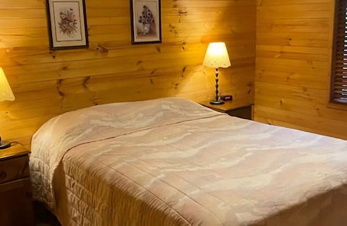 El alojamiento es una casa de cedro de 4 dormitorios y 3 baños con un altillo que alberga el dormitorio principal con cama grande, 1 cama individual, baño y sala de TV.