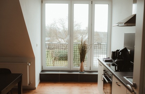 El apartamento consta de una sala de estar con un sofá cama de 1,60 m de ancho y un televisor grande, un dormitorio con una cama francesa de 1,60 m de ancho, un baño con luz natural, una ducha y, por último, una cocina bien equipada, en la mesa 4 La gente tiene mucho espacio para tomar sus comidas. Las ventanas de la sala de estar y la cocina abren la vista hacia pequeños jardines bien cuidados y en las copas de los grandes árboles viejos y catalogados de un pequeño parque tranquilo (Hermanas de Schoenstatt) en las inmediaciones. Para un descanso relajado, las habitaciones pueden ser oscurecidas por las persianas eléctricas conectadas a las ventanas insonorizadas.