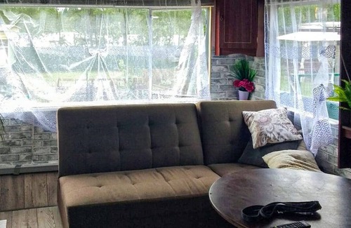 La acogedora casa móvil le da la bienvenida en un lugar idílico rodeado de bosques y naturaleza y cerca de un lago donde se puede nadar. Podrá relajarse en un ambiente acogedor en las habitaciones funcionalmente amuebladas. Prepare algo delicioso para comer después de un día lleno de acontecimientos, el sofá de la zona de estar le garantiza que podrán disfrutar juntos de las veladas después de sus aventuras.