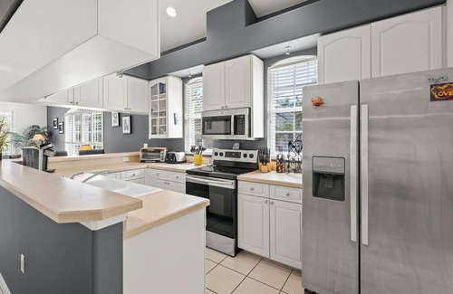 Hermosa casa de 2 pisos con un garaje para 2 autos y piscina ubicada en el atractivo vecindario de Bay Isles, en la isla de Siesta Key. La casa tiene un plano abierto con techos abovedados y muchas ventanas para una sensación espaciosa, brillante y aireada. La sala de estar es bastante grande, con un sofá seccional muy cómodo, TV digital de pantalla plana y reproductor de DVD. Incluye cable y WiFi gratis. La habitación den / family está justo al lado de la sala de estar y está bien equipada con juegos de mesa y un estéreo. Las puertas correderas con contraventanas de madera dan acceso al patio al aire libre y al área de la piscina desde la sala de estar y el estudio. La casa tiene una lavadora y una secadora grandes justo al lado de la cocina escondida en un armario grande con puertas para que se oculte cuando no esté en uso.