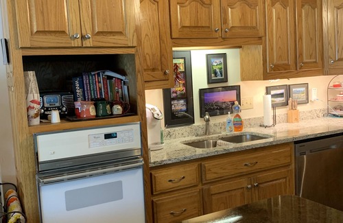 Sala de estar se asoma al agua con registros de gas en la chimenea. El salón se abre al porche cubierto. La sala de estar es grande con un techo abovedado, baldosas de cerámica nuevas y una alfombra grande. ¡Tiene dos sofás y dos sillones para proporcionar muchos asientos! Un sofá se convertirá en una cama de tamaño completo.