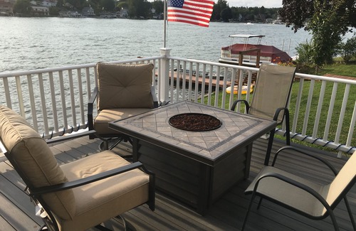 Con futón de tamaño completo, juego de pelota, mesa de ping pong, dardos y más juegos. Además de una vista de un millón de dólares del lago.