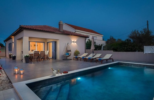 La hermosa villa Karla Nin se encuentra en la pintoresca localidad de Nin, en la costa dálmata. Construido en un estilo moderno, esta villa de lujo ofrece muchas ventajas como la proximidad al mar y la naturaleza virgen que le dará unas vacaciones de ensueño. La capacidad de alojamiento de la villa es de un máximo de 9 personas y del total de tres dormitorios, dos están equipados con camas dobles y uno con dos camas individuales. También hay dos camas supletorias de 90x200 cm y un sofá cama esquinero adicional. La villa dispone de dos cuartos de baño totalmente equipados y un aseo adicional. También tiene a su disposición una lavadora, plancha y tabla de planchar. El amplio salón y la moderna cocina con zona de comedor dan acceso a la terraza, donde encontrará una relajante piscina de 24,5 m² y tumbonas, que le permitirán disfrutar de momentos de relax bajo el sol de la tarde y en compañía de sus seres queridos. En el patio también hay una barbacoa exterior y una mesa de comedor exterior. En el verde césped del patio, los más pequeños disfrutarán sin duda del tobogán y del parque infantil. En el patio de la villa hay dos plazas de aparcamiento y fuera del patio hay otras dos plazas de aparcamiento. La primera playa llamada Playa de la Reina está a 1,5 km de la villa y es considerada la playa más larga de Croacia con una longitud de 8000 metros. Esta playa está relacionada con la leyenda del primer rey croata Tomislav, que pasó aquí momentos románticos con su reina, viendo el amanecer con una vista inolvidable de la cercana montaña Velebit. En Nin hay numerosas playas con barro curativo, cuyos efectos beneficiosos ya se conocían en tiempos de Cleopatra. La ciudad de Nin también es conocida como la ciudad real, título que debe su significado histórico a la capital de los gobernantes nacionales croatas. Nin también tiene una historia más larga, que se remonta a la época iliria, incluso al siglo IX a.C cuando fue fundada por una tribu iliria llamada Aenona. En la antigüedad, la ciudad de Nin fue un importante puerto marítimo, y más tarde, en la Edad Media, se construyeron aquí los famosos barcos de la antigua armada croata llamados Condura Croatica, que hoy se pueden encontrar en el Museo de Antigüedades de Nin. Cerca de Nin encontrará diversas opciones de ocio, como puenting en el puente de Maslenica o el Aquapark de la isla de Pag. En la isla de Pag también encontrará la playa ibicenca croata de Zrše, que se convierte en un lugar de entretenimiento y diversión de primera clase durante los meses de verano. En esta isla también encontrará auténticas delicias gastronómicas, como el queso de Pag. No deje de visitar uno de los muchos restaurantes o tabernas donde podrá degustar una variada cocina dálmata en la que predomina el pescado fresco de mar, el jamón serrano, el queso, el aceite de oliva o el vino casero. Disfrute de todo el encanto del verano en las playas curativas de Nin y del lujo de Villa Karla Nin, que le brinda momentos perfectos de paz y privacidad.