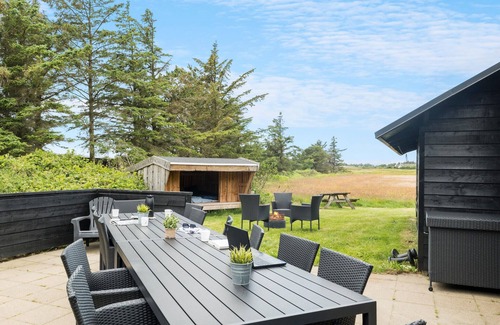 Pase sus próximas vacaciones en Stenbjerg Strand en esta espaciosa casa de vacaciones, que puede alojar a varias familias o a un grupo más grande. Entre en el amplio salón, que impresiona por su mobiliario elegante y moderno. Ponte cómodo en los acogedores sofás frente a la estufa de leña. Utiliza la cocina totalmente equipada para preparar tus platos favoritos y servirlos en la larga mesa de comedor, que ofrece mucho espacio para comidas de convivencia.