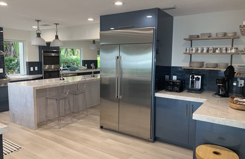 La cocina gourmet está hecha para el entretenimiento y está equipada con electrodomésticos profesionales como una estufa de gas Dacor, un refrigerador / congelador bajo cero, nuevos hornos dobles GE, un cajón calentador y 2 lavavajillas. Se incluyen todos los accesorios de primera línea, recién comprados, como una cafetera, licuadora, procesador de alimentos, licuadora de inmersión y exprimidor (todos ellos, Cuisinart y Kitchenaid).