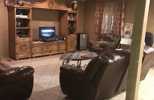 Los huéspedes están seguros de disfrutar de unas vacaciones memorables en este totalmente amueblado, 4 habitaciones / 2. 5 baños en un rancho. El dormitorio principal / principal tiene una cama de matrimonio, mientras que las 3 habitaciones restantes están amuebladas con camas tamaño queen, cómodas para dormir 8 personas. La amplia sala de estar está amueblada con 3 sofás y un centro de entretenimiento con TV. La cocina es perfecta para comer ya que está equipada con horno, refrigerador de 2 puertas, lavavajillas y una gran mesa de comedor. Situado en una gran tierra en el país, los huéspedes pueden disfrutar de paz y tranquilidad. Puede acomodar remolques de caballos.