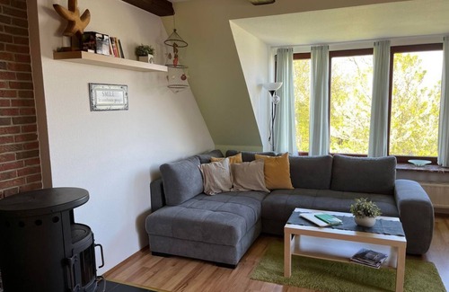 Apartamento Heverstrom para hasta 5 personas arriba El acceso al apartamento está en el lado norte a través de un pequeño balcón. En la cocina, que está totalmente equipada con lavavajillas, vitrocerámica, horno, licuadora, tostadora, cafetera, tetera, hervidor de huevos, nevera / congelador, también hay una chimenea para la que está lista la leña. El apartamento tiene dos habitaciones, una habitación para 3 personas con una cama individual y literas, edredones de 140 x 200 cm (habitación infantil) se encuentra arriba, una habitación para 2 personas con cama doble, edredones de gran tamaño 155 x 220 cm (padres) En el ático. Baño con ducha y WC. Todas las camas son de 90 x 200 cm. TV, pequeño sistema de música. Por favor traiga toallas y paños de cocina. No hay impuesto turístico en Tümlauer-Koog