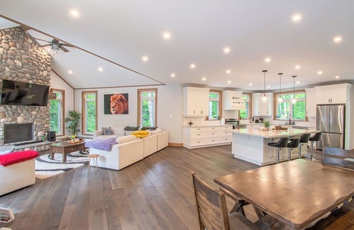 Hidden Paradise offers a stylish and spacious retreat on the serene narrows of Whitestone Lake near Dunchurch, Ontario. This beautifully appointed, single-level cottage sleeps up to 16 guests across five thoughtfully designed bedrooms—perfect for multi-family gatherings or extended family escapes. One bedroom is tailor-made for kids or cousins, featuring two double beds with single bunks above, creating a fun and functional space for younger guests.