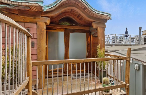 Sentada en la arena de la playa de Miramar, esta peculiar casa de dos niveles es ideal para el turista que quiere relajarse y divertirse en la playa. Al entrar en el nivel principal de la Casa Hobbit, la gran ventana pintoresca con vistas al océano llamará inmediatamente su atención. No es el alquiler de vacaciones promedio, esta casa cuenta con características arquitectónicas interesantes, como los techos de vigas altas, paneles de madera cálidos, una escalera de caracol y muchos rincones y curvas interesantes.