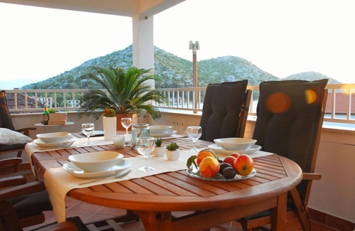Visit us in Croatia in our “three star” holiday apartment. You can expect 130m² on 2 floors with 3 bedrooms, 1 large kitchen-living room, 1 living room and 1 bathroom. From the terrace you have a wonderful view of the water and the mountains. The bedrooms all also have a balcony. The first floor is not inhabited. So you have the house to yourself.