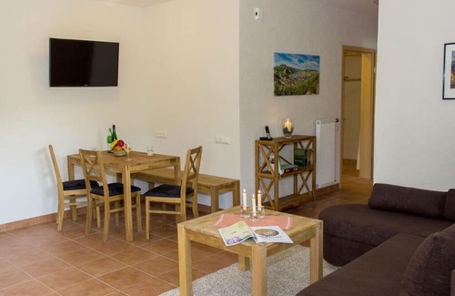 There are three holiday apartments in the bungalow. In the certified barrier-free "Sonnenlay" there is plenty of space for 4 people on 61 square meters. The living room is equipped with a flat screen satellite TV, stereo system, telephone and free WiFi. A modern kitchenette with ceramic hob, oven, microwave, dishwasher and refrigerator is integrated. You share the large garden with old fruit trees and delicious fruit, a play area and sunbathing lawn, fire pits, play equipment, parasols and a pavilion with us and the other holiday guests. Your covered balcony invites you to linger outdoors, and not just in bad weather. Two bedrooms with French beds and a shower/toilet complete the modern comfort of the holiday apartment.