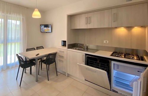 The holiday apartment is located in an apartment house and is modern and functional furnished. The property is located in a holiday complex. For use are available: parasol, sun lounger and terrace. Outdoor dining areaHoliday resort1 restaurant, coffee shop and internet (WLAN). LocationCastelnuovo del Garda. The holiday apartement is located in a holiday complex, on a closed garden plot with meadow, bushes and trees, limited by a fence. The family-friendly complex is in a quiet location approx. 2 km from Lake Garda, with a panoramic view of the surrounding Alps. The ground floor apartment has a terrace, the first floor apartment has a balcony.
