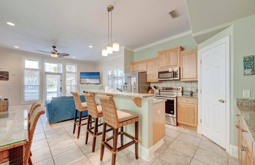 Walk into this wonderful three (3) story beach house and drop your bags! With literally room for the whole family, sleeping up to seventeen (17) people comfortably you will have a great family vacation! You enter the home in the great room that encompasses the open living room, dining room and fully stocked open kitchen with a comfortable sleeper sofa, love seat and chair. Also, on the main floor you have a side entrance that takes you to the secluded back yard with a stone paver deck and pool to cool off in. You also have access to the first of three (3) bedrooms. All three (3) bedrooms have their own ensuite bath. The main floor bedroom does share its bathroom with a separate entrance for guests. The bedroom with its high ceiling has a massive built-in full size mattress bunk bed system that sleeps four (4). You also have a fully equipped laundry room before you head upstairs to the second floor with a private large master bedroom at the front of the home with a king size bed, full ensuite bath and a private balcony facing the gulf! Across the hall after a built-in desk is the third bedroom that mirrors the first-floor bedroom with the same built-in full size mattress bunk bed system and an ensuite bath. Head up to the top floor family room where you have a mini bar equipped with a mini fridge and microwave. You have another custom built-in full size mattress bunk system with three (3) levels and a half bath. The couch in the family room is also a sleeper sofa. Bring all of the kids for amazing sleepovers! No need to worry about where to park at the beach. You are literally across the street from the gulf, with beach access through R. Seltzer Park. When you come off the sand at R. Seltzer Park, you have outdoor showers to wash the sand away before skipping across the street to your family vacation retreat.