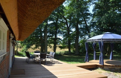 On the ground floor, the hallway with the historic tiled floor leads to the eat-in kitchen with a large dining table for 12 people, which flows into the living room. A spacious terrace adjoins it. Three sleeping areas and three bathrooms offer space for up to six people. On the upper floor there are three more bedrooms and two beautiful bathrooms, one with a bathtub and shower, in the dormers of the thatched roof. There is also a spacious hallway as a playroom for children. The large south-facing windows provide a view over the dike. The old threshing floor gives an idea of how the farmers lived and worked around 1792.