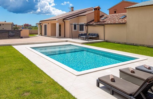 Welcome to our stunning holiday home located in Bibići! This spacious retreat is perfect for up to 8 people and offers a serene escape surrounded by natural beauty. The highlight of the property is its large garden, complete with a charming pergola where you can relax and soak in the tranquil atmosphere. Indulge in the refreshing swimming pool, with a delightful hydromassage feature. You can spend lazy afternoons lounging by the poolside, enjoying the warm sun and cool breeze. Adjacent to the pool, there is a roofed outdoor kitchen equipped with a barbecue area, perfect for hosting memorable cookouts with friends and family. For your convenience, there is a separate toilet near the outdoor area, ensuring easy access without having to go inside the house. Inside, you'll find three double bedrooms, each providing a comfortable and private space for a restful night's sleep. Two of the bedrooms feature en-suite bathrooms, offering added privacy and convenience, while the third bedroom has a separate bathroom. The living room is a cozy haven, complete with a convertible sofa that can accommodate two additional guests. You can unwind here, enjoying the company of your loved ones or catching up on your favorite shows. The well-equipped kitchen allows you to prepare delicious meals during your stay. Located in Bibići, this holiday home is conveniently situated just 18 km away from the nearest beach. Additionally, the beautiful medieval town, located a mere 3 km away, offers a captivating glimpse into history and culture. With its stunning amenities, convenient location, and comfortable accommodation, our holiday home in Bibići promises to make your vacation truly memorable.